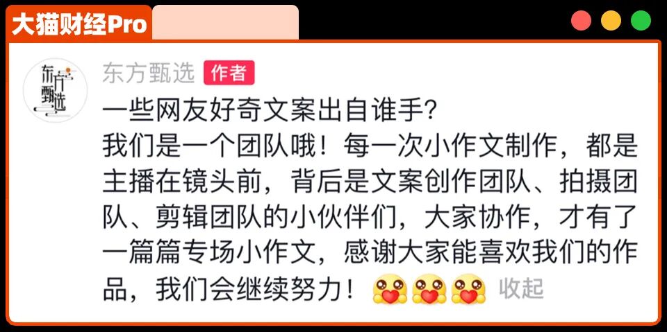 粉丝们认为,这肯定是董宇辉写的,但是东方甄选评论说,来自“文案创作团队”,董宇辉调侃小编“自以为了解业务”,小编破防,否认“胡回复”。