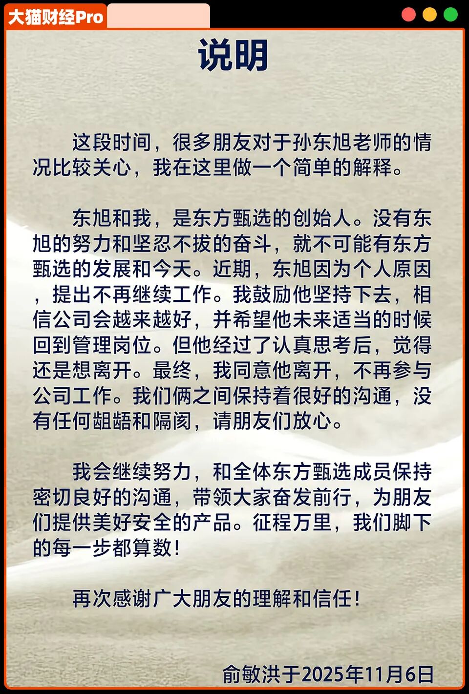 俞敏洪发文,确认东方甄选前CEO孙东旭离职。