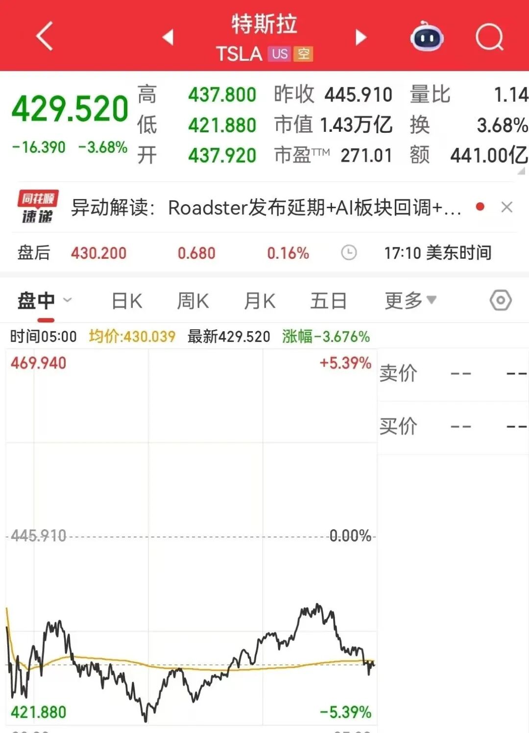 特斯拉跌超3%,市值一夜蒸发545亿美元(约合人民币3882亿元)。