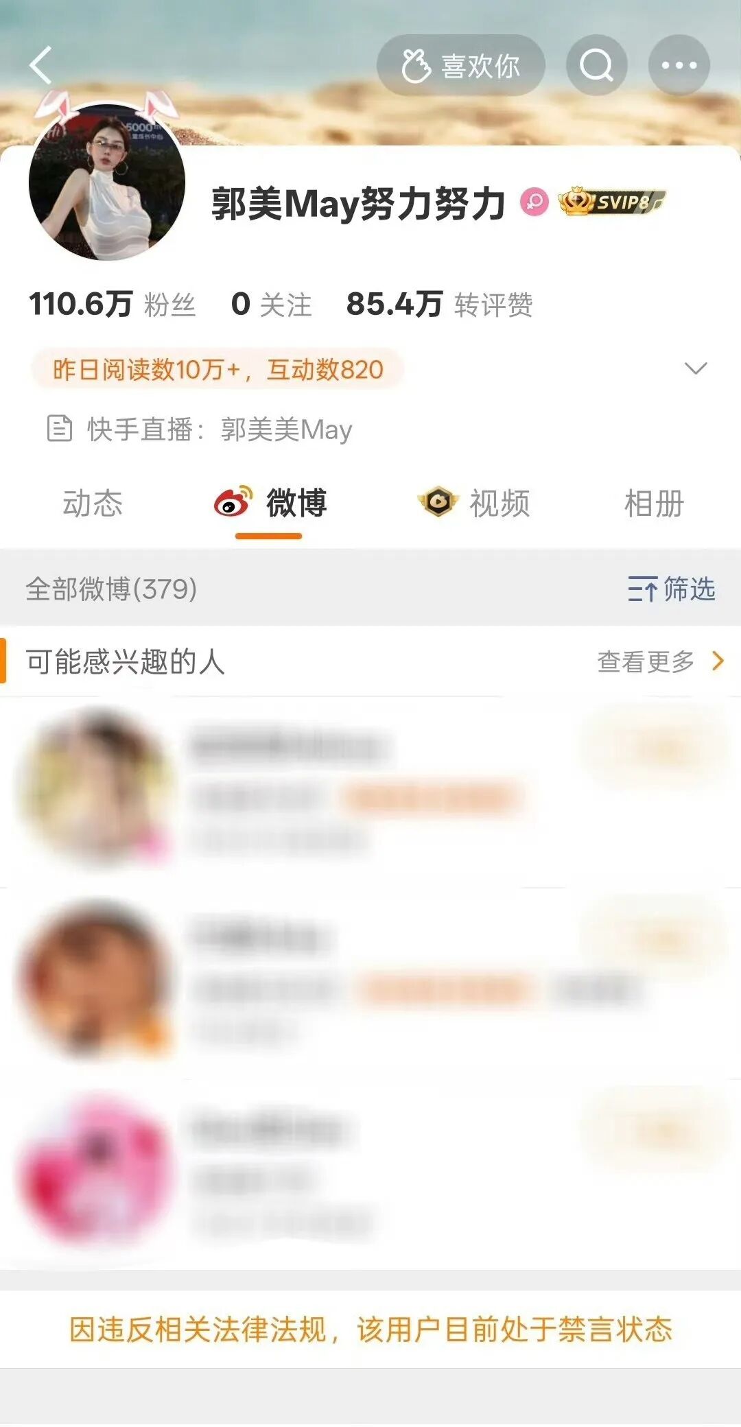 只是,刚刚晒完豪车,有网友发现郭美美的微博账号被禁言了。紧接着,其账号被封禁,账号已搜查不到具体的内容。