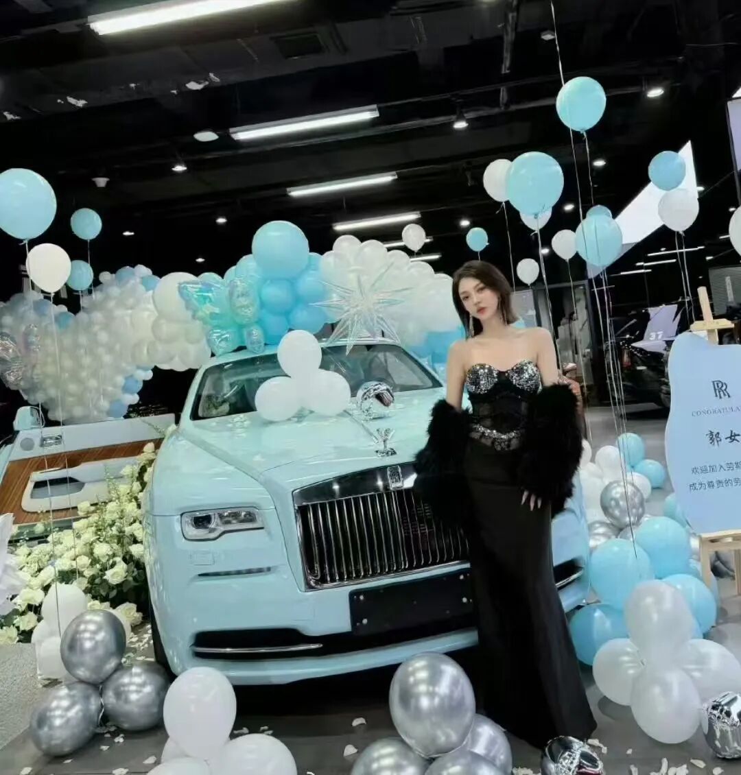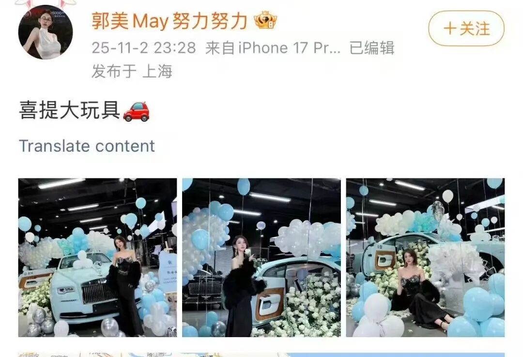 前几天,郭美美在其微博账号@郭美May努力努力 发布一则图文。文案是:喜提大玩具。并配了三张她自己和一辆蓝色劳斯莱斯的合照。