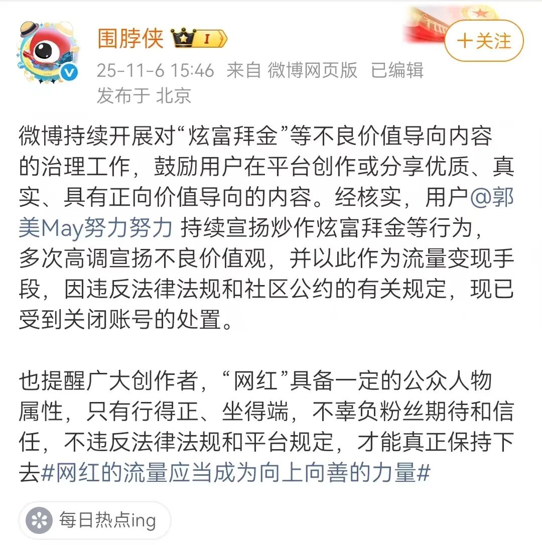 对此,微博官方账号@围脖侠给出了答案。其发文称,用户“郭美May努力努力”持续炒作炫富拜金等行为,多次高调宣扬不良价值观,并以此作为流量变现手段,因违反法律法规和社区公约的有关规定,现已受到关闭账号的处置。