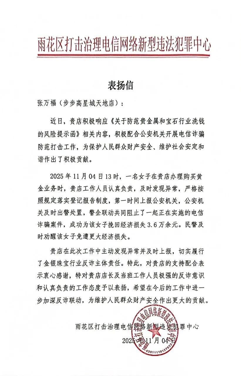 11月5日下午,井湾子派出所为张万福珠宝店(步步高星城天地店)送来表扬信,对该金店工作人员在反诈工作中发挥的重大作用表示赞扬和感谢! 警方提醒:凡是要求你购买黄金邮寄至指定地址或当面交付给“第三人”的,都是诈骗!
