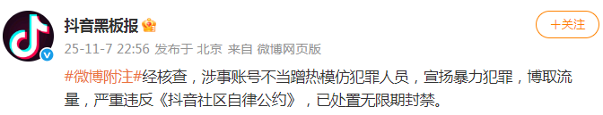 7日夜间,抖音黑板报发文回应:经核查,涉事账号不当蹭热模仿犯罪人员,宣扬暴力犯罪,博取流量,严重违反《抖音社区自律公约》,已处置无限期封禁。