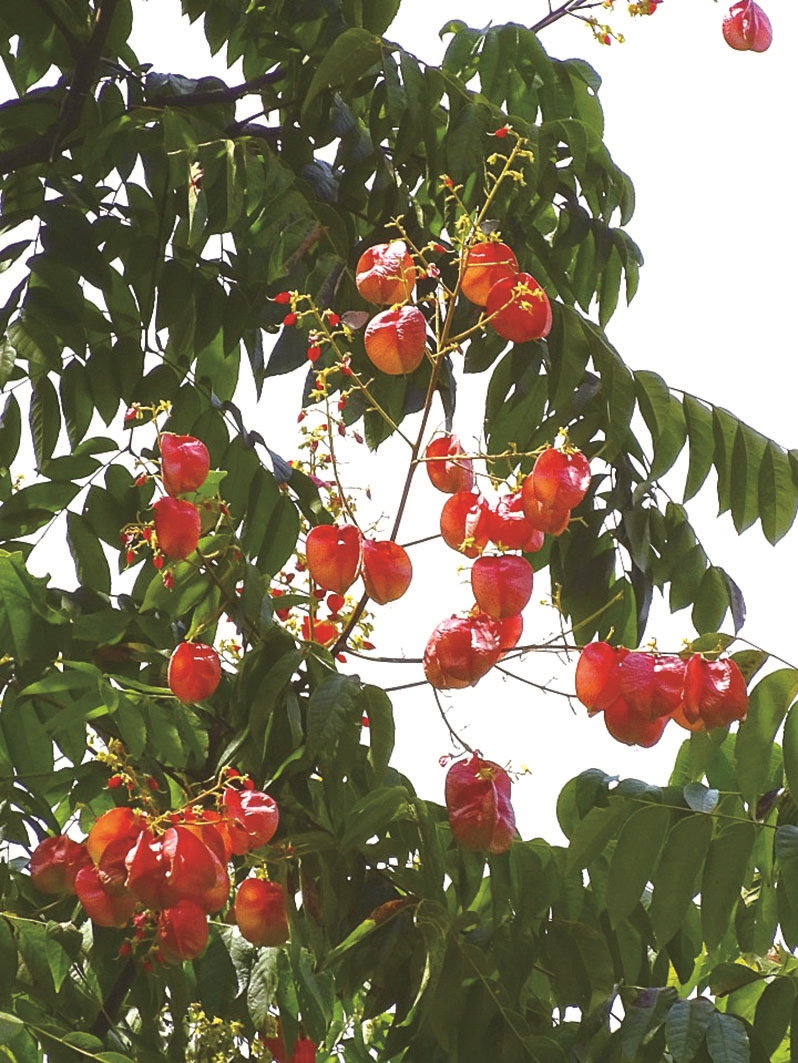 黄山栾树夏季枝繁叶茂,有良好的遮荫效果;夏末秋初,金黄色的小花铺满树冠;入秋后,红色蒴果又与鲜黄色秋叶交相辉映。