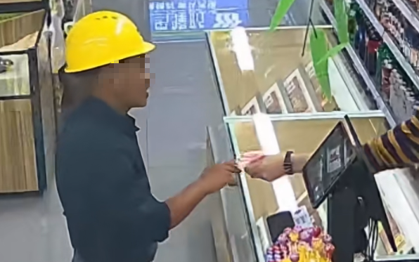 找到这位工人大叔时,他手里正拿着砖块,非常激动。确认无误后,工人大叔前往超市,拿回了自己掉落的一百元钱。