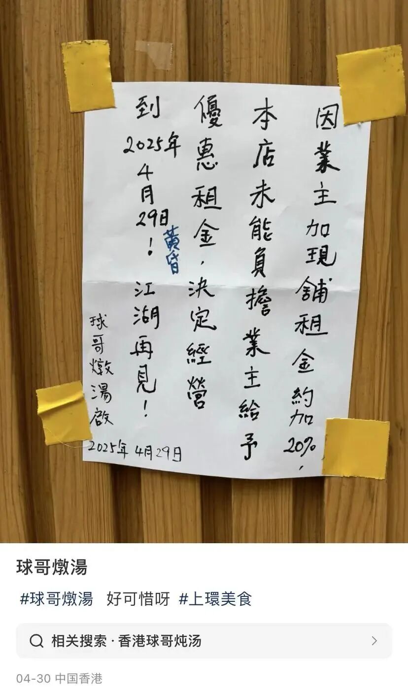 比如上环地标“球哥炖汤”因被业主要求加租20%,负担不起因此结业。