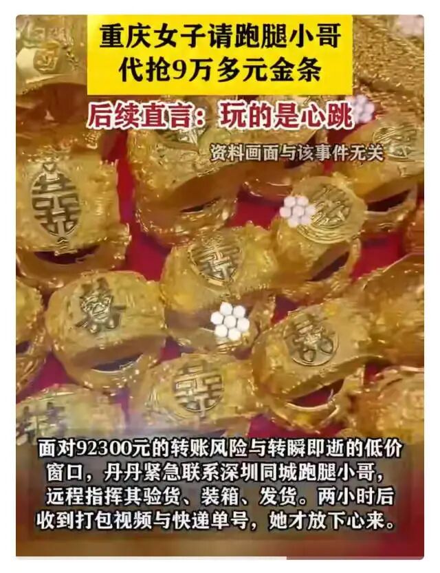 面对近万元的价差与即将关闭的交易窗口,她做了一场豪赌:紧急联系深圳跑腿小哥代验货、装箱、发货,完成了一笔自己从未亲身参与的百克金条购买。
