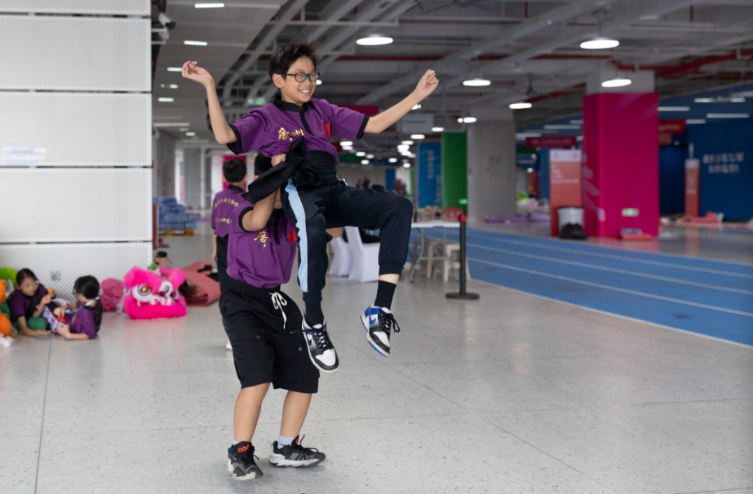 10月27日,广东奥体中心,醒狮小演员在联排间隙练习舞狮。