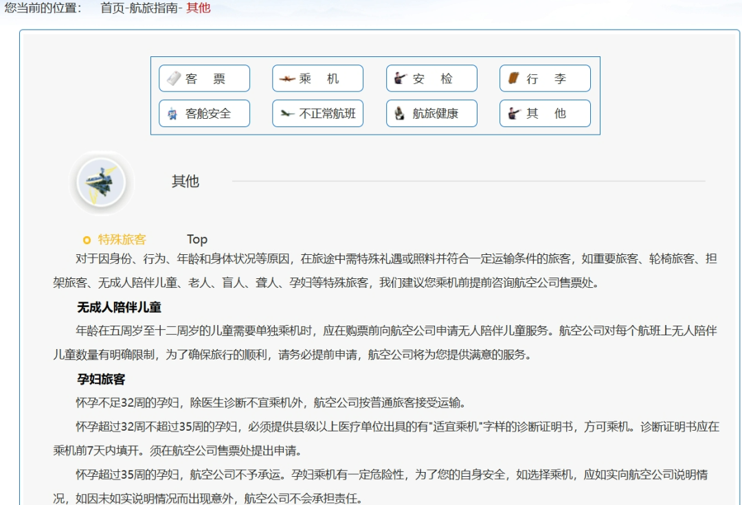 小观查询中国民用航空局的官方网站,在航旅指南中,也明确,“对于因身份、行为、年龄和身体状况等原因,在旅途中需特殊礼遇或照料并符合一定运输条件的旅客,如重要旅客、轮椅旅客、担架旅客、无成人陪伴儿童、老人、盲人、聋人、孕妇等特殊旅客,我们建议您乘机前提前咨询航空公司售票处。”