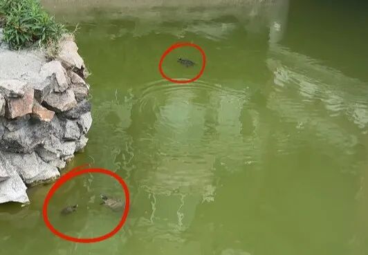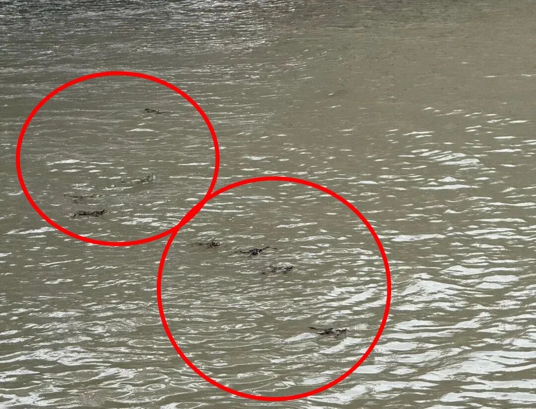 水面上,多只个头较大、周身乌黑的牛蛙游动的画面,引人不适。