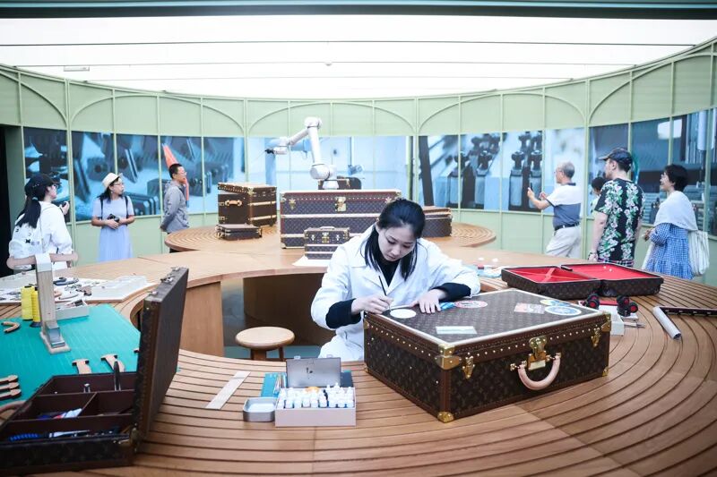 “路易号”内的“非凡之旅”回顾展,现场展示箱包制作技艺。海沙尔摄“‘路易号’是对零售新模式的探索。”要客研究院院长周婷表示,“路易号”模糊了观展、娱乐与购物、用餐的界限,将沉浸式参观体验转化为一场探索之旅,极大地提升了体验的深度与记忆点。而“体验消费”和“情绪价值”,恰是吸引客流的关键变量,也是当下零售业的核心竞争力。