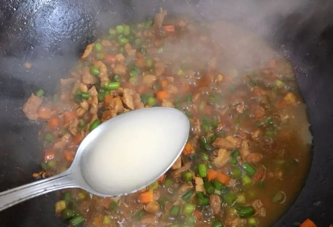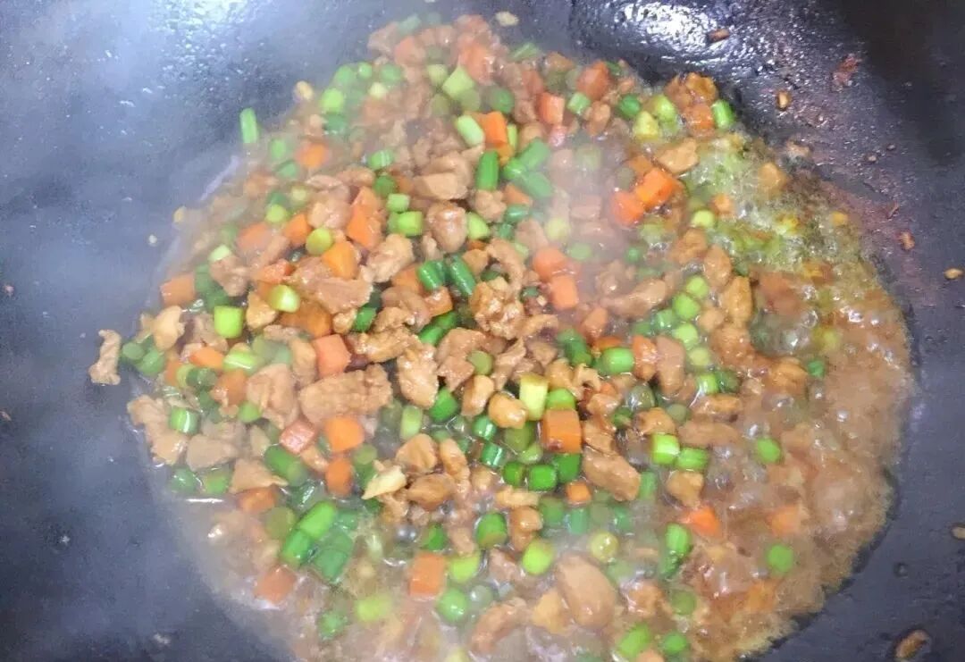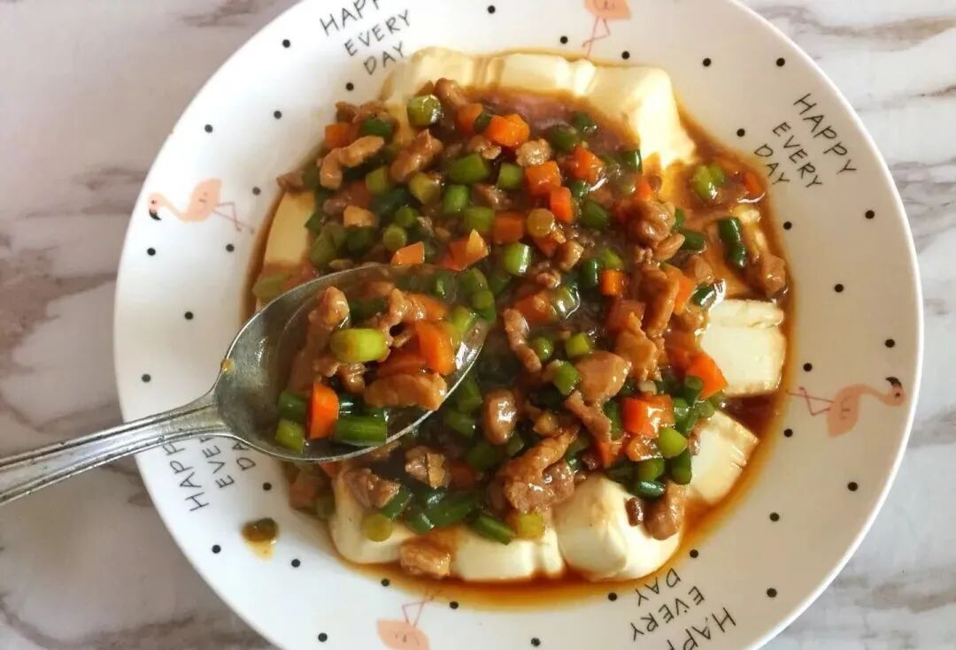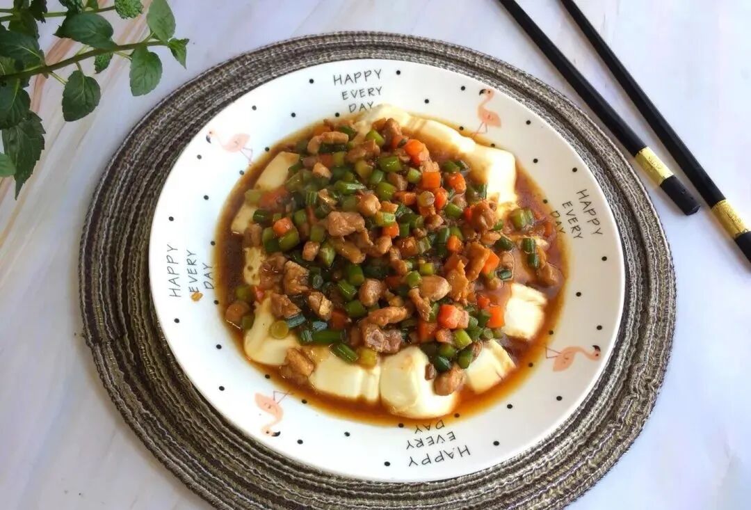 蒜苔肉末浇豆腐 所需食材:猪肉 150克、蒜苔4~6根、内酯豆腐1盒、胡萝卜1小段、生姜 适量、大蒜 2瓣、豆瓣酱1汤匙、食盐 适量、白胡椒粉 适量、一品鲜酱油2汤匙、蚝油0.5汤匙、白糖 少许、水淀粉 少许 1,我们先准备好所需的食材,猪肉也可以换成牛肉,具体的量可以根据自己的饮食习惯适当调整,但是不管是猪肉还是牛肉,具体的做法都大致相同;蒜苔准备4~6根就够了;这道菜使用内酯豆腐要比使用老豆腐口感更佳嫩滑,如果特别喜欢老豆腐的口感,也可以替换;胡萝卜用来增加菜品的营养,也用于给菜品配色,如果喜欢吃辣的,可以换成小米辣;再准备生姜、大蒜、豆瓣酱以及其他的调味料就可以了 2,接着我们来处理豆腐,内酯豆腐先把其表面的封膜撕去,倒扣在盘子中,然后把盒子的四个角剪去就可以轻松取出了,接着用刀把豆腐划成小块儿,这样更方便入味,再在豆腐上均匀地淋上一汤匙的一品鲜酱油 3,蒸锅中水开后放入豆腐,上锅蒸5分钟即可 4,接下来我们再把猪肉切成小丁放入碗中,加入适量的白胡椒粉、食盐、一品鲜酱油和少许食用油搅拌均匀腌制一会儿备用 5,再把胡萝卜切成小丁、蒜苔切成小丁、大蒜和生姜切成末备用 6,点火起锅,加入适量的底油,先放入腌制好的肉丁快速划散翻炒均匀 7,把肉丁翻炒至变色后加入蒜末、姜末翻炒出香味 8,接着加入一汤匙豆瓣酱,翻炒均匀,如果喜欢吃辣的,这里的豆瓣酱可以换成郫县豆瓣酱 9,再加入蒜苔丁和胡萝卜丁翻炒均匀 10,接着把蒸好的豆腐中的水倒入锅中,转小火咕嘟几分钟 11,开始调味,加入适量的食盐、一汤匙一品鲜酱油、0.5汤匙蚝油和少许的白糖提鲜,把调味料翻炒均匀 12,再加入少许水淀粉,让汤汁稍微有些浓稠就可以关火了,水淀粉不要太过厚重 13,接着把蒜苔肉丁盛出浇在蒸好的豆腐上,就可以端上餐桌开始品尝啦 14,这道做法简单,口感嫩滑鲜美的蒜苔肉末浇豆腐就做好了,自己在家做干净卫生又不失健康美味,老人孩子都喜欢 小贴士 1,豆腐最好选用内酯豆腐,这样口感更加滑嫩。 2,肉丁最好先腌制会儿再炒,不会发柴发硬。 来源:千厨百味、如有侵权请联系删除