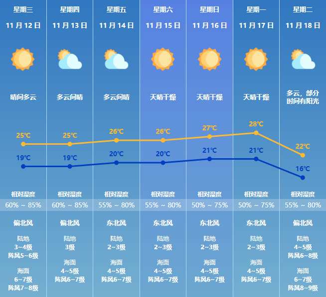 温馨提示:近期珠海市海面风力较大,滨海旅游和海上交通请注意安全;天气干燥,请注意用火用电安全。