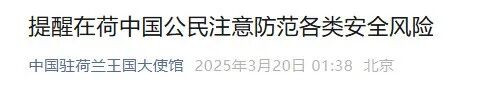 此外,记者查询发现,今年3月,中国驻荷兰王国大使馆官方账号曾发文“提醒在荷中国公民注意防范各类安全风险”。