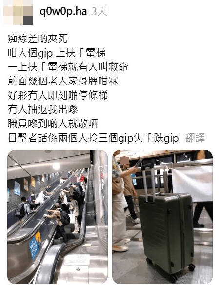 有人贪图方便,硬是拖着行李上扶手电梯,结果行李箱失控下滑,差点让一整个电梯上的人受伤。