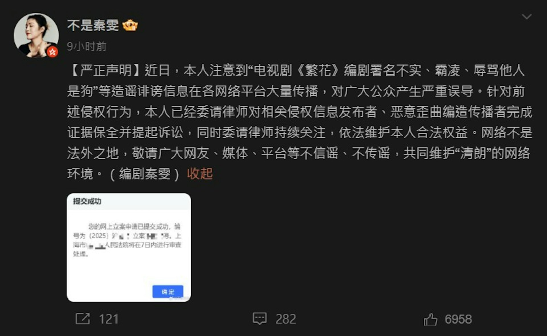 秦雯于 9 月 20 日发布律师声明,称相关指控为“造谣诽谤”,已完成证据保全并提起诉讼,附上上海市人民法院立案申请截图。