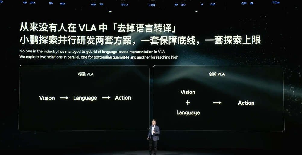 何小鹏在发布会上透露,去年,团队经过激烈讨论之后,决定并行开发两套智驾方案:第一代VLA和第二代VLA。前者的方案是V到L再到A,后者是V+L到A,也就是把L转移到了输入端。