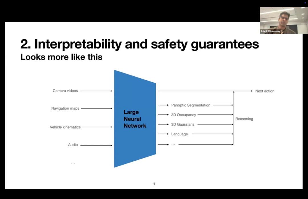 这个架构的逻辑与特斯拉自动驾驶副总裁Ashok Elluswamy今年10月在ICCV 2025上分享的架构类似。尽管特斯拉并没有表明这是否是他们最新一代技术架构,也没有公开更多细节,但从分享中可以看到,特斯拉也没有完全抛弃与V相关的多模态信号,而是让这种多模态信号一方面产生L作为中间表征,另一方面生成全景分割、3D占用、3D高斯表征等比原始多模态信号更高维的信号,然后让这类多模态感知信号与L的自然语言解释一起,共同决定输出的Action。