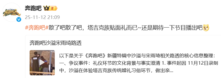 12日晚,《奔跑吧》节目组官博发文回应:散了吧散了吧,塔吉克族贴面礼而已~还是期待一下节目播出吧。