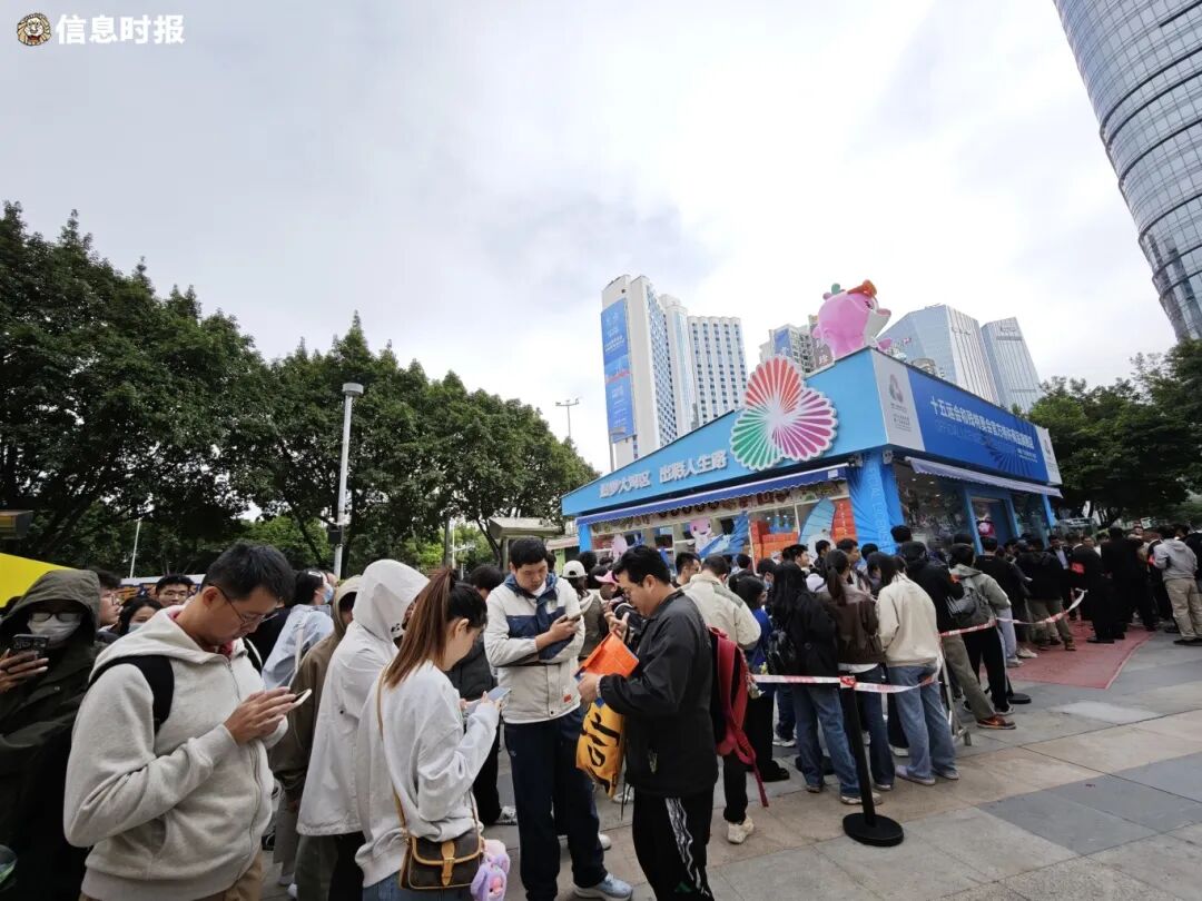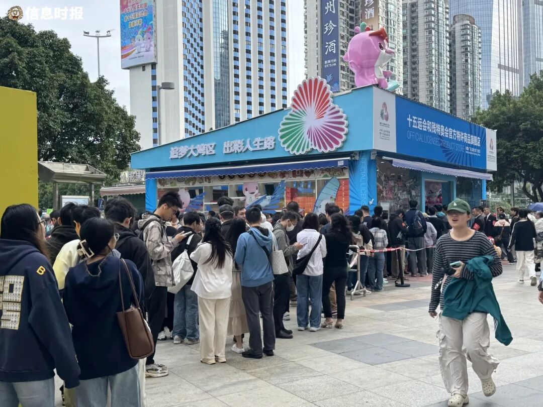 正佳广场店店员黄先生介绍,自十五运会开幕式举办前,门店生意就已逐渐升温,开幕式后更是迎来爆发式增长。“每天早上七八点就有市民来排队等放号,十点开门后,300个盲盒基本一小时内就卖完了。”