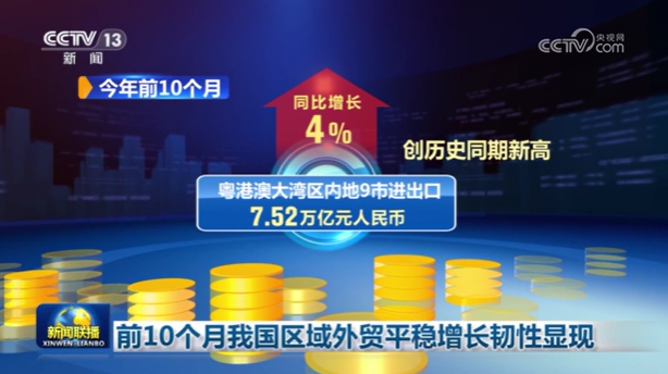 数据显示,粤港澳大湾区内地9市进出口总值在今年前10个月达到7.52万亿元人民币,同比增长4%,创历史同期新高。