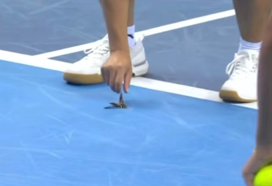 11月12日,第十五届全运会网球比赛在广东珠海举行,比赛期间一只昆虫闯入赛场,现场工作人员迅速处置。
