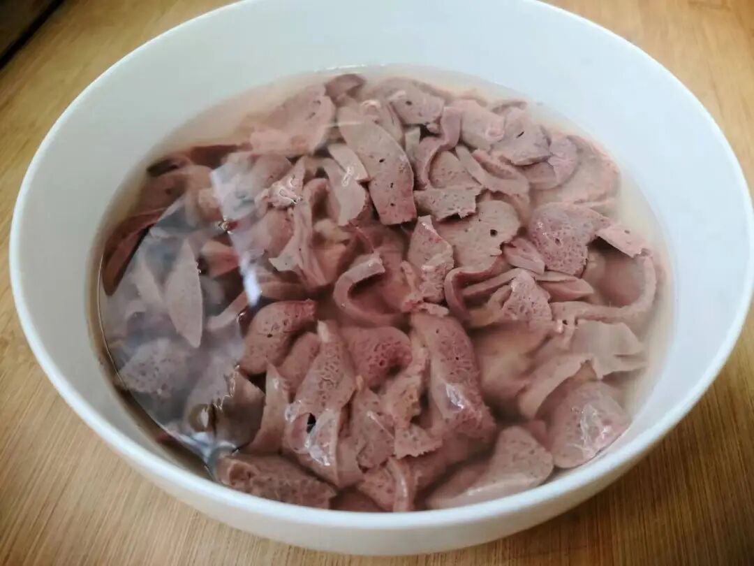 1、我们把猪肝放在清水中,浸泡几个小时,去除里面的血水,猪肝洗干净切成薄片。
