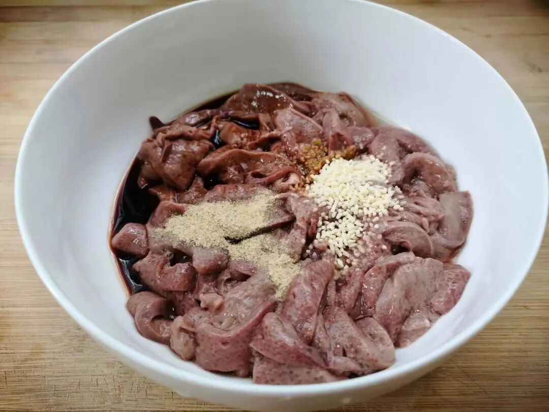 4、再加入一把淀粉,再次抓匀后腌制5分钟,让猪肝充分腌制入味。