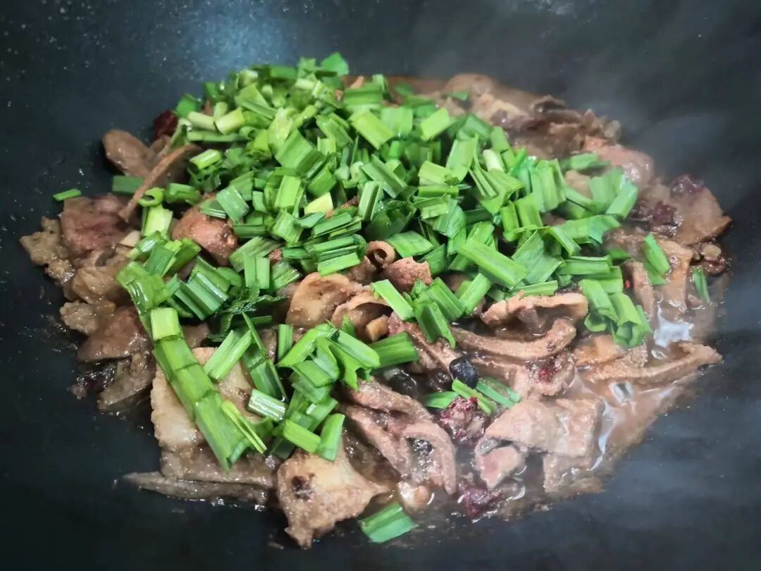 7、将腌制好的猪肝倒入锅中,用大火快速翻炒,最后,再撒上蒜苗段,拌匀即可盛出。
