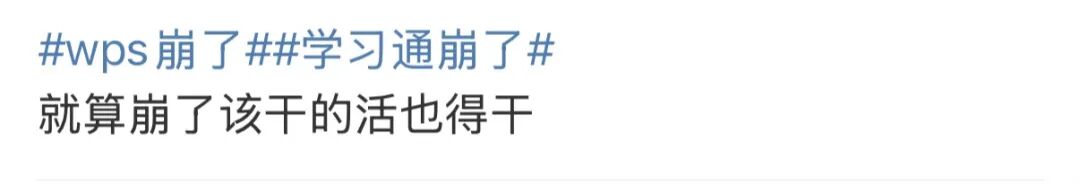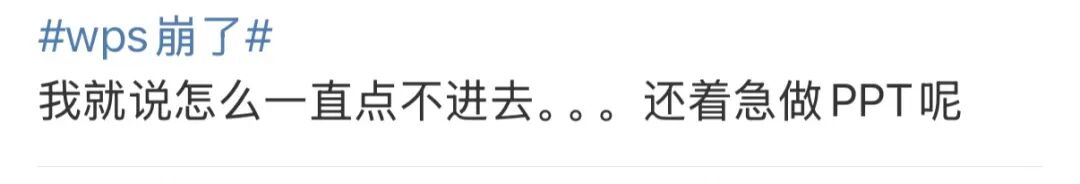 多位网友发文称,“WPS在线文档崩了,分享不出去也不打开。”有网友表示,“当初用这个线上文档就是图好用,现在催着要报表”。还有网友称,“WPS崩了,打工人天塌了。”