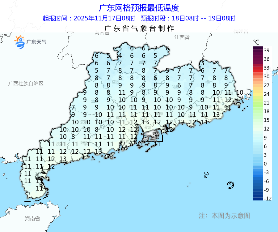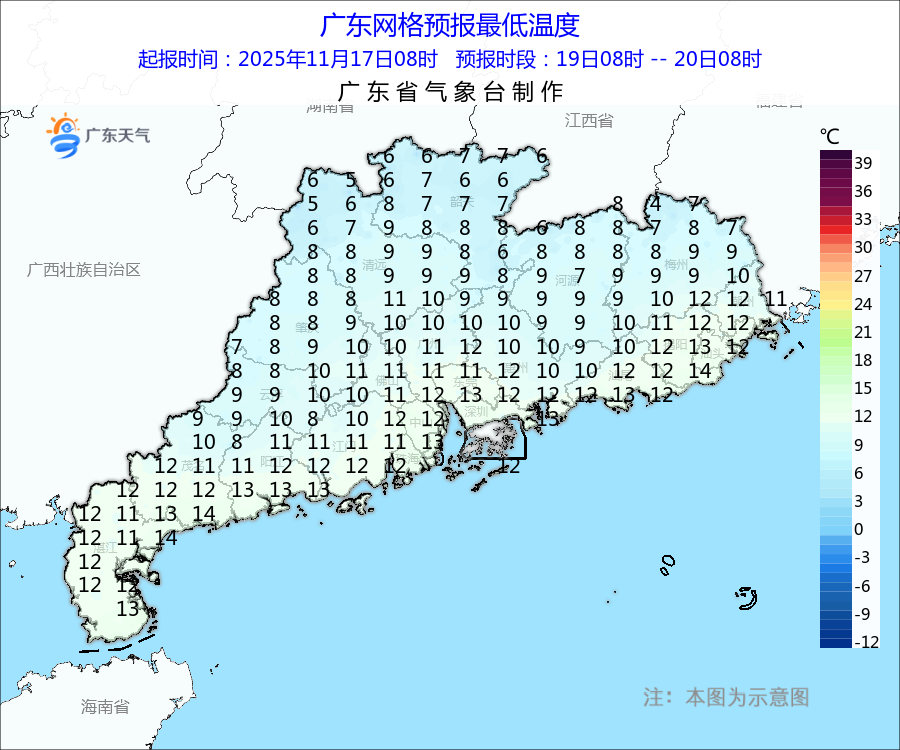 广东具体预报: 大部分市县过程最低气温将出现在20日早晨前后 据@广东天气,预计,受强冷空气影响,18-19日,广东大部市县阴天,部分市县有小雨或零星小雨;各地气温将较17日明显下降,昼夜温差小,过程气温下降幅度:粤北市县下降8~10℃,中南部市县下降6~8℃;大部分市县过程最低气温将出现在20日早晨前后,其中粤北偏北市县5~8℃(粤北高海拔山区2~5℃);18-19日受冷空气影响时广东陆地有阵风5~7级,江河湖面和高地最大阵风可达7~8级,广东海面风力6~8级阵风9级。 具体预报: 18日(周二),广东大部市县阴天,有小雨或零星小雨。各地气温明显下降,天气转寒凉。 19日(周三),粤北市县多云到阴天,局部有小雨,中南部市县阴天,有零星小雨。气温维持在较低状态,天气寒凉,最低气温:粤北和珠江三角洲北部市县6~9℃(粤北高海拔山区2~5℃),南部沿海市县13~15℃,其余市县10~12℃。 20日(周四),粤北市县阴天转多云,其余市县零星小雨转多云。最低气温:粤北偏北市县5~8℃(粤北高海拔山区2~5℃),粤北其余市县和珠江三角洲北部市县8~10℃,南部沿海市县13~15℃,其余市县10~13℃。 21日(周五),南部市县多云到晴天,其余市县晴间多云。白天气温回升,昼夜温差大。最低气温:粤北偏北市县6~9℃(粤北高海拔山区2~5℃),粤北其余市县和珠江三角洲北部市县9~11℃,南部沿海市县14~17℃,其余市县11~14℃。 广州具体天气