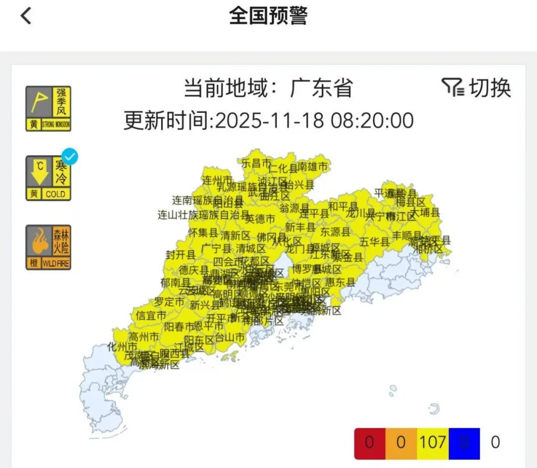 截至今日(18日)8时许 广东发布了107个 寒冷黄色预警信号 覆盖了广东大部分地区
