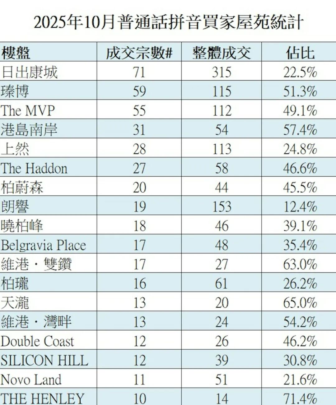 是什么让内地买家如此热衷香港豪宅?中原地产亚太区副主席兼住宅部总裁陈永杰指出,降息政策逐渐显效,加上“供平过租”的市场环境,令不少专业人才加速入市,甚至有租客直接转为买家。与此同时,北水资金持续流入香港,不仅支撑股市,也为楼市注入强大动力。 数据显示,10月份内地买家平均每宗成交金额达到1137万元,较6月份的低谷期870万元反弹近30%,显示出购房者信心明显回暖。 在全港402个屋苑中,内地买家遍地开花,但尤以将军澳日出康城表现最为抢眼,10月录得71宗成交,稳居榜首。九龙城瑧博和西半山The MVP分别录得59宗和55宗,成交量占楼盘整体的一半左右,显示出内地买家对高品质住宅的强烈偏好。