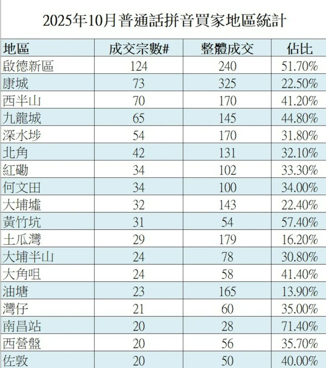 分区来看,九龙区成为内地买家的最爱,10月份录得595宗成交,占据绝对优势;港岛区紧随其后,录得347宗;新界东和新界西分别为232宗和195宗。 值得关注的是,豪宅市场同样获得内地资金的青睐。10月份一手及二手市场共录得71宗超过5000万元的大额成交,较9月份的53宗激增逾30%。其中,普通话拼音买家占24宗,比例高达44%,创下11个月新高。最大宗成交来自西半山The MVP两套顶层特色单位,总面积近6000平方尺,以2.66亿元成交,呎价突破4.4万元,买家由两人联名购入,其中一人英文名字为普通话拼音。