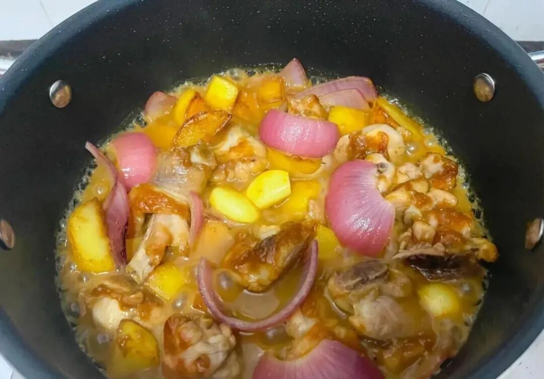 今天分享一道咖喱薯仔鸡 风味独特、香味浓郁、汁香美味 鸡肉嫩滑入味、薯仔粉糯 好吃又下饭 食材:鸡腿、鸡翅、土豆、洋葱、蒜 调料:花生油、盐、白砂糖、生抽、沙茶酱、料酒、淀粉、咖喱、椰浆 鸡腿、鸡翅洗净沥干水分斩小块 加1小勺盐、半勺白砂糖、1勺生抽、1勺沙茶酱、1勺料酒、1勺淀粉抓拌均匀 再加少许油锁味腌制20分钟 土豆削皮切块 热锅热油放入土豆煎至表面金黄盛出备用 锅内留油放入鸡肉煎至两面金黄 放入洋葱、蒜瓣炒香 再放入一块咖喱 把咖喱炒融化,让鸡肉裹上咖喱酱 放入煎过的土豆加适量开水 盖上盖子焖5分钟 最后加少许椰浆拌匀就可以出锅啦 鲜香美味的咖喱薯仔鸡就做好了 实在太惹味了 汤汁用来拌饭也是非常好吃的 大家不妨试试哦…… 来源:千厨百味、如有侵权请联系删除