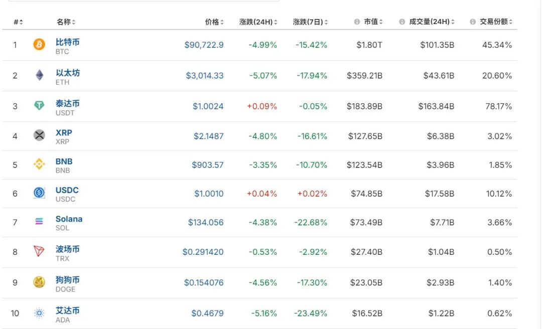 截至发稿,比特币报90722.9美元,跌幅4.99%。以太坊、艾达币跌超5%,狗狗币跌4.56%。