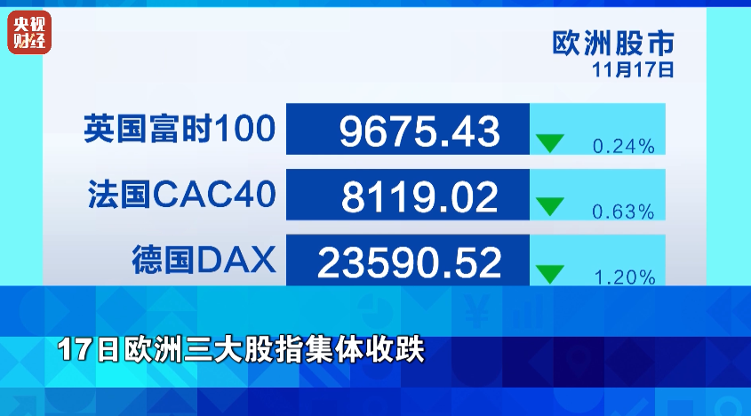 受此影响 国内品牌金饰价格也随之下调 当地时间周一,受近期美联储官员密集释放的“鹰派”言论影响,投资者对美联储12月降息的预期概率,已从一个月前的约90%下降至目前的约43%。美联储理事沃勒当天表示,剔除AI行业,美国的商业投资正在下降,美股市场风险偏好受到抑制。同时,投资者普遍等候芯片巨头英伟达财报与美国9月非农就业报告,交投谨慎,美国三大股指周一集体收跌。截至收盘,道指下跌1.18%,标普500指数跌0.92%,纳指跌0.84%。 17日国际金价连续三个交易日下跌 贵金属方面,美联储12月降息前景不明朗,美元指数周一反弹,令金价承压,国际金价周一连续第三个交易日下跌。截至收盘,纽约商品交易所12月黄金期价收于每盎司4074.5美元,跌幅为0.48%。 17日美股芯片股与部分科技股下跌 芯片股和部分科技巨头股价下跌是周一拖累美股下跌的主要原因。芯片巨头英伟达周一收跌1.88%,最新持仓文件显示,美国知名科技行业投资人彼得·蒂尔旗下的对冲基金,在今年第三季度清仓了重仓股英伟达。 此外,云服务巨头亚马逊即将发行150亿美元债券进行融资,发债规模比此前预估高出30亿美元,这是亚马逊过去三年来首次发行以美元计价的债券。亚马逊此举表明,持续扩张的AI基础设施投资令美国科技巨头现金流普遍承压。今年以来,脸书母公司Meta已发行300亿美元债券,甲骨文和谷歌的发债规模都为180亿美元。亚马逊股价周一收跌0.78%。 17日欧洲三大股指集体收跌 欧洲方面,本周将有欧元区10月CPI终值和11月制造业PMI初值等重要经济数据公布,投资者周一观望情绪浓厚。受科技、金融和化工等行业蓝筹股下跌的拖累,欧洲三大股指周一集体收跌。截至收盘,英国股市跌0.24%,法国股市跌0.63%,德国股市下跌1.20%。 17日国际油价小幅下跌