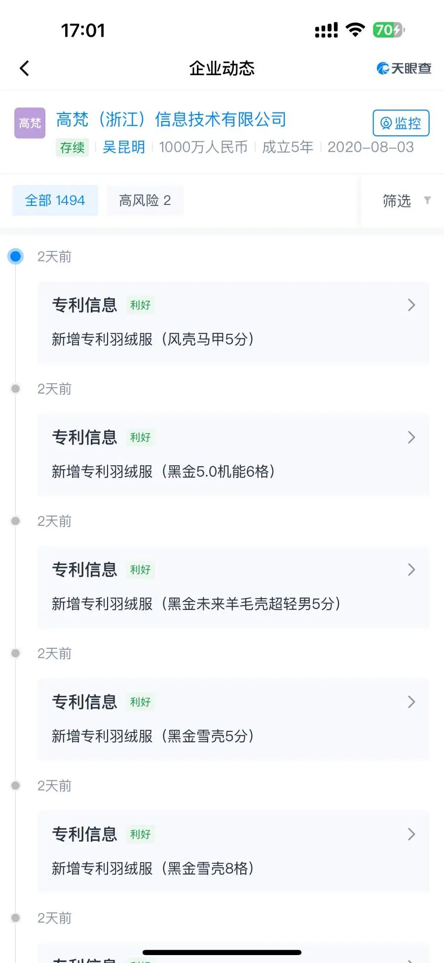 据财中社报道,高梵手握161项发明专利,位居全球羽绒服行业发明专利首位。