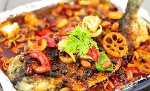 今天做的是麻辣味的烤鱼,快来看看具体怎么做吧。 【香辣烤鱼】准备食材:鲇鱼一条、高汤150克、藕40克、平菇100克、青笋100克、土豆80克、洋葱80克、香菜2根、油炸花生米20克、姜5克、大葱50克、蒜8瓣、干辣椒10根、花椒粒5克、辣椒面1茶匙、郫县豆瓣酱40克、孜然粉半茶匙、五香粉半茶匙、香叶2片、酱油2汤匙、料酒2汤匙、橄榄油3汤匙、盐适量。 制作方法:鲇鱼处理干净、洗净、用厨房纸吸干水分,用刀在两面划斜一字花刀,将鱼分成两半,鱼背相连。在鱼身上两面淋入酱油料酒,撒花椒粒、麻椒粒、辣椒面、孜然粉、五香粉、盐、涂抹均匀,腌制20分钟。藕、青笋、土豆去皮、切片;平菇撕小块;洋葱去皮、切丝。 香菜去根、切段;姜、蒜去皮、切片;大葱去皮、切段,干辣椒切圈。烤盘上垫好锡纸,将腌好的鲇鱼及调味品放在锡纸上,刷一层橄榄油,锡纸包紧,放入预热好的烤箱中层,上下火200度烤20分钟。砂锅中倒入2汤匙橄榄油,六成热时下姜、蒜、大葱、香叶爆香。 加入郫县豆瓣酱炒出红油,加高汤煮开,下藕片、平菇、青笋片、土豆片、洋葱丝煮至断生,待汤汁熬煮至浓稠。烤箱中取出烤鱼,炒好的配菜及汤汁浇到鲇鱼身上,放回烤箱中上下火200度继续烤20分钟。撒油炸花生米,剩余的橄榄油与干辣椒圈一同加热,烧至八成热时淋在烤鱼身上,撒香菜段调味。