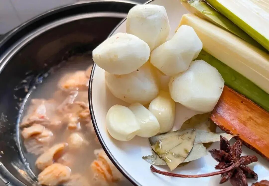 放入马蹄、甘蔗、姜片、蒜瓣、桂皮、八角、香叶
