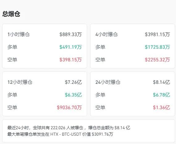 加密货币全网24小时超22万人爆仓,8.14亿美元(约合人民币58亿元)灰飞烟灭。