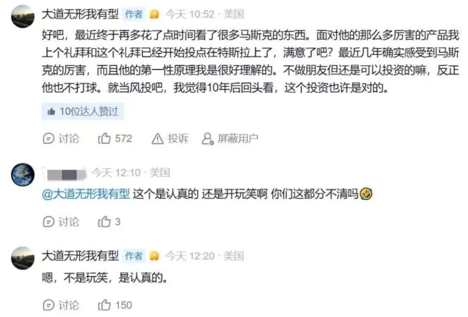 11月20日,段永平在雪球上公开发文表示:“最近终于再多花了点时间看了很多马斯克的东西。面对他的那么多厉害的产品,我上个礼拜和这个礼拜已经开始投点在特斯拉上了,满意了吧?最近几年确实感受到马斯克的厉害,而且他的第一性原理我是很好理解的。不做朋友但还是可以投资的嘛,反正他也不打球。就当风投吧,我觉得10年后回头看,这个投资也许是对的。” 一石激起千层浪,网友们对此议论纷纷。面对部分网友的询问,段永平也进行了回应:“不是玩笑,是认真的。”