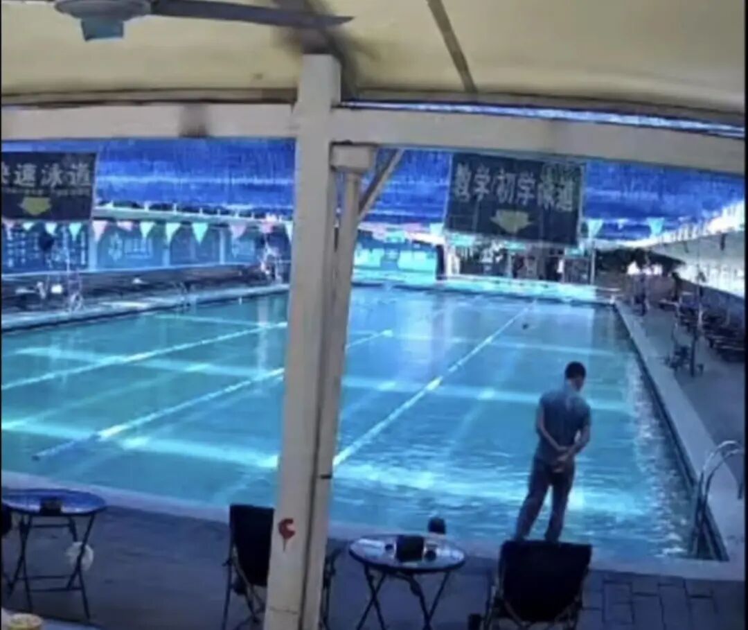 柳女士说,从视频中可见,事发在10点多钟,当时其女婿双脚穿着脚蹼从泳池另一端往回游,到终点后人就没有浮起来,一直沉在水中。有三名救生员当时在现场,其中一名救生员站在女婿沉水处附近观望。还有一名救生员走过来看了一眼,又走开了。最后有救生员发现不对劲,拿一根杆子将人捞起。柳女士说,事发后,三名救生员都不愿开口,泳池方面也没有给说法。 一名救生员低头看水中情况