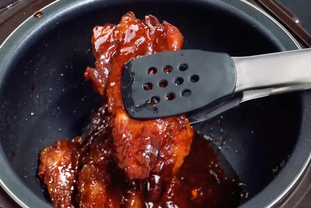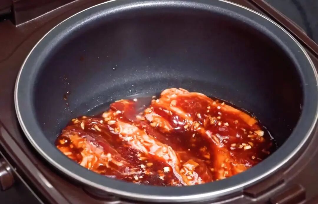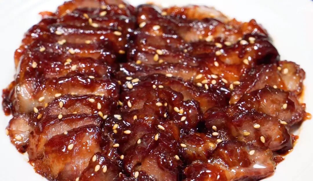 6,30分钟后翻一个面,这样使肉入味更均匀,盖上盖子再次选择快速煮饭模式,焖煮30分钟。 7,开盖的那一瞬间味道实在是太香了,闻得我直咽口水,真想咬上一口,取出晾至不烫手切成薄片装入盘中,再撒上一点白芝麻,蜜汁叉烧肉就做好了,色泽鲜亮,鲜嫩多汁,口感软嫩,吃起来一点也不油腻