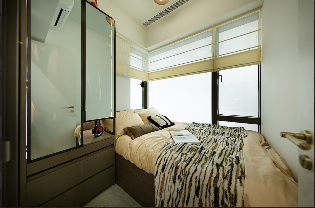 衣柜采用一体化设计,灵活切换挂衣与床头柜功能: