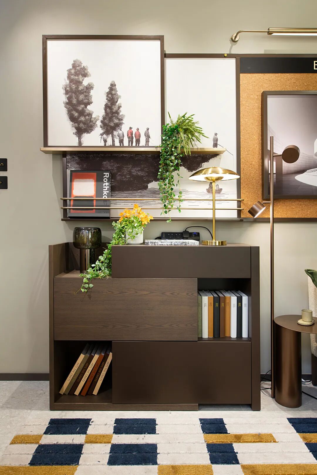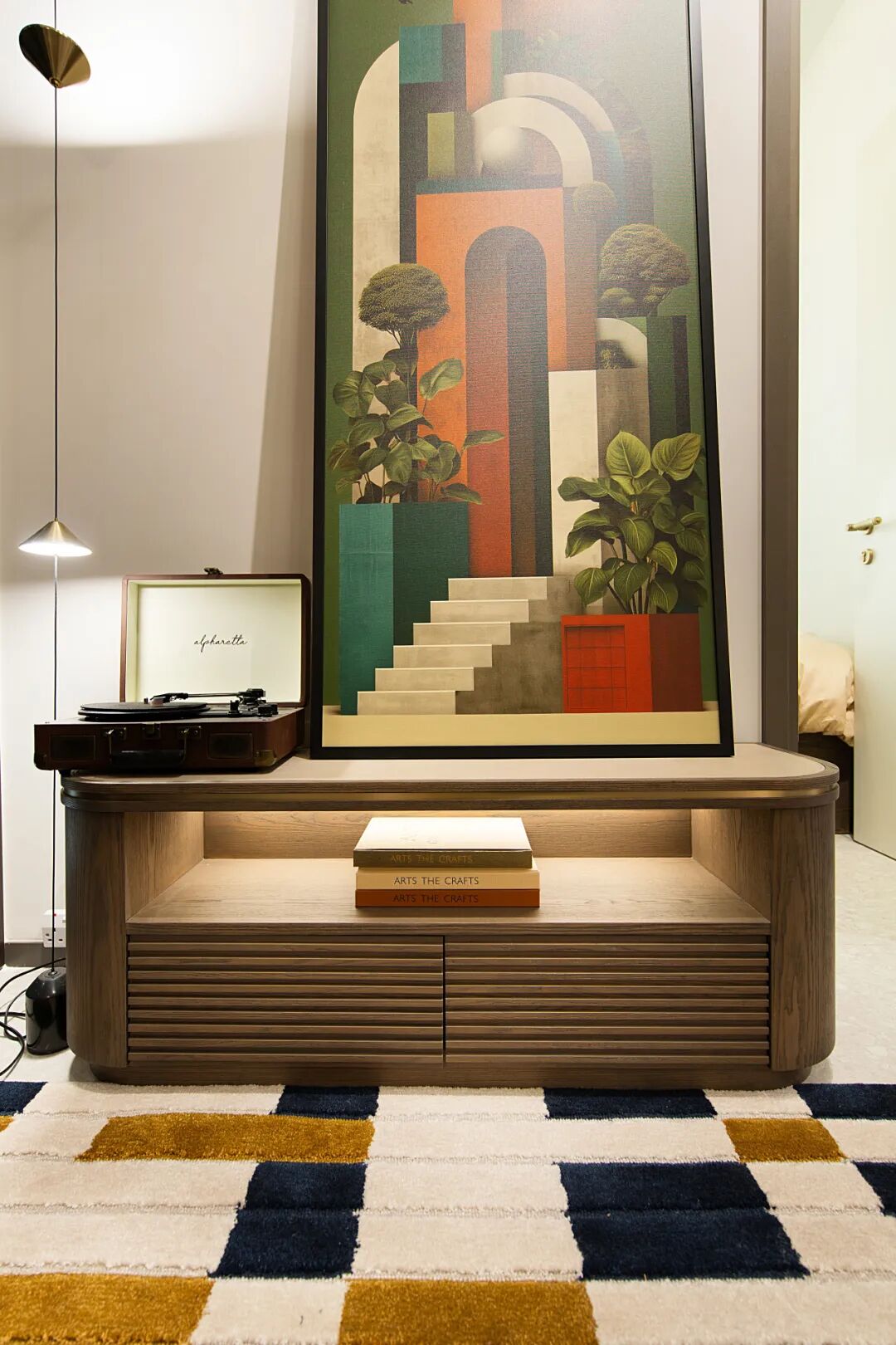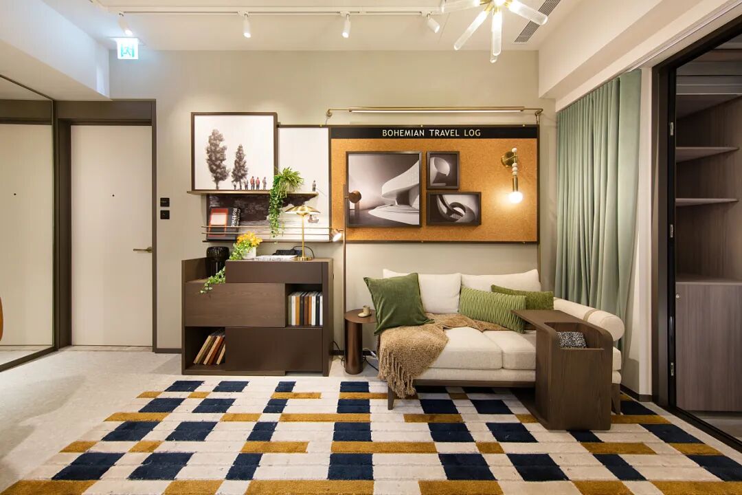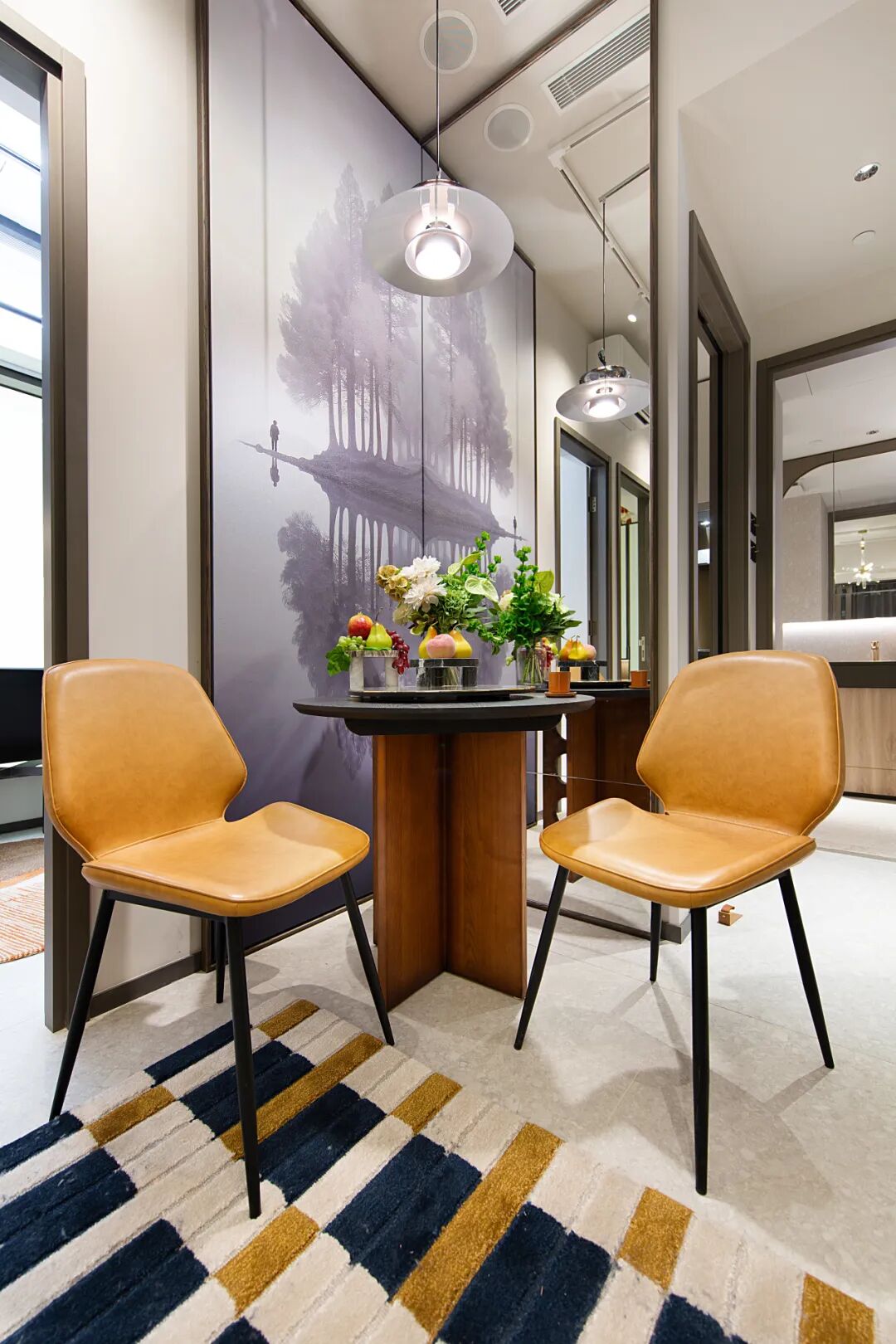 客饭厅之间以家具与光影自然分界,墙面如同小型艺廊,多幅挂画与灯饰交织出立体的空间感。