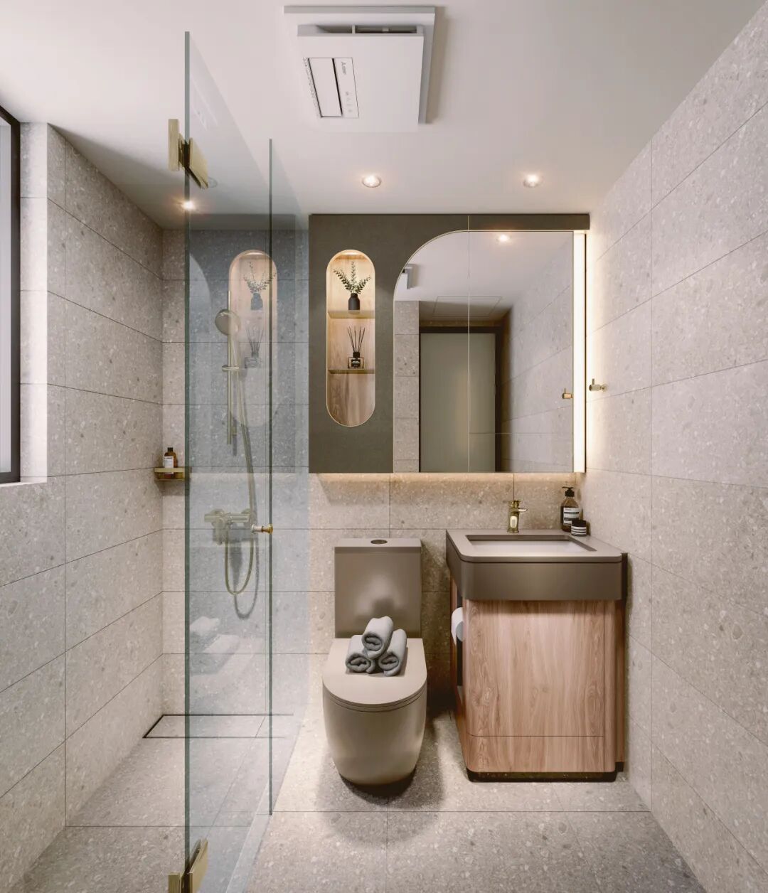 浴室是罕有的明厕设计,通风采光俱佳,延续简洁格调;同时采用干湿分离布局,储物空间充足,MIRROR+多功能镜柜还贴心配备USB与电源插座。