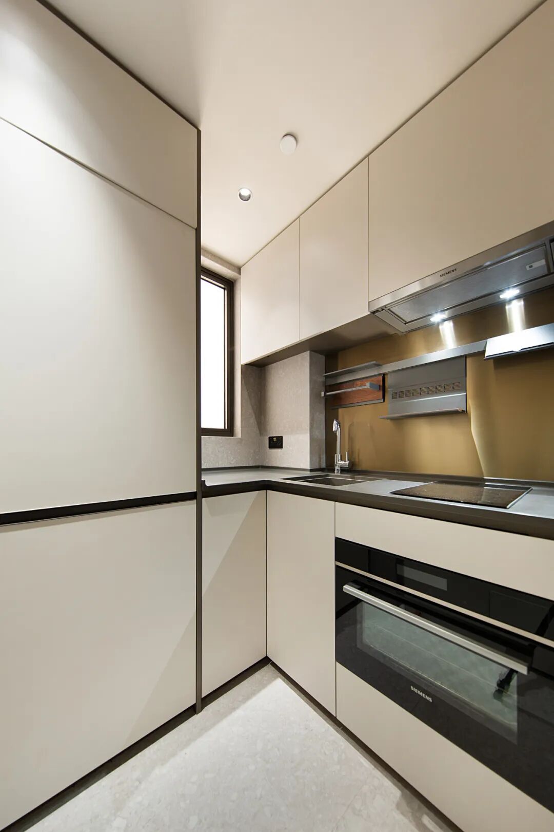 厨房是梗厨设计,还有窗户,通风采光好,配置德国品牌家电,电磁炉、嵌入式雪柜、蒸焗炉,一应俱全: