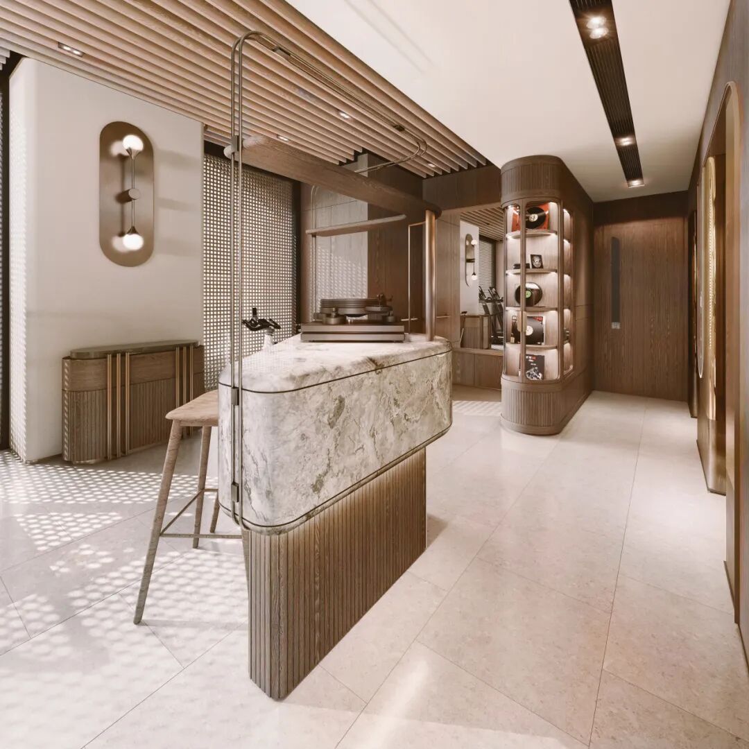 空间以流线型曲面设计延展,光影柔和流动,融合艺术与建筑的气息。